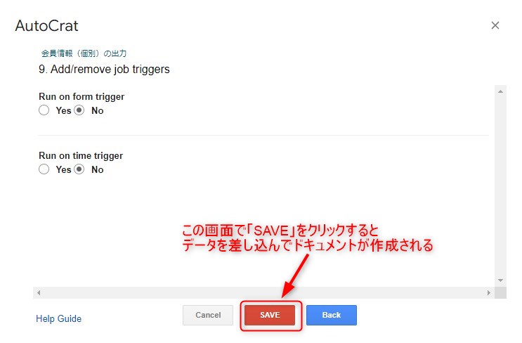 今回はひとまずその場で出力したいので、両方とも「No」にして、赤い「SAVE」ボタンをクリックします。