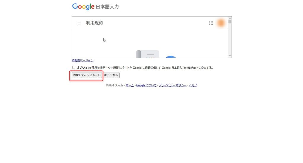 「Google日本語入力をダウンロード」ボタンをクリックし、利用規約を確認した後、「同意してダウンロード」をクリックします。