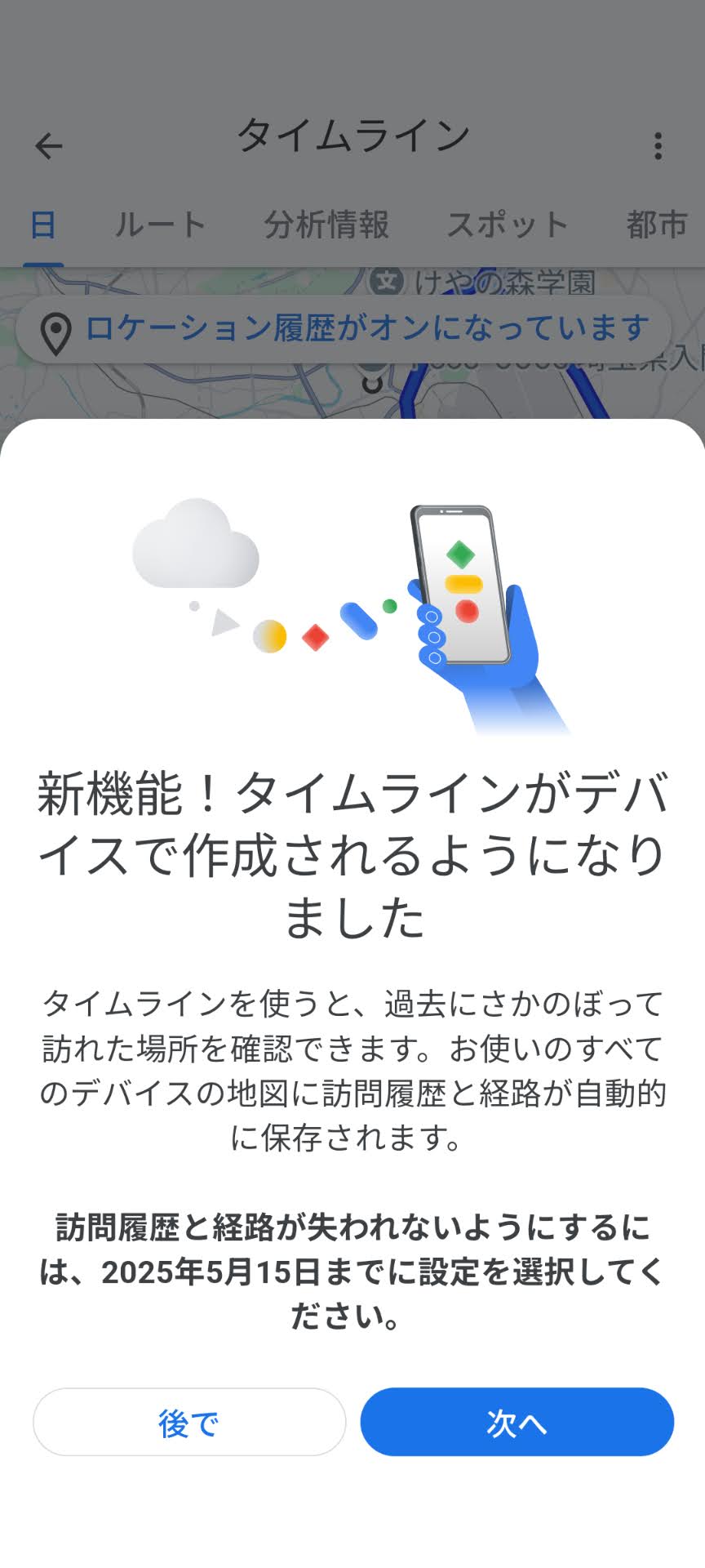 以前からGoogleタイムラインを利用されている方には、昨年からタイムラインのデータ保存を促すメールが来てはいないでしょうか。これは、今まではGoogleアカウントのクラウドにタイムラインデータが保存されていたのですが、今後は端末そのものにデータが保存されるようになるため、今までクラウドにあったデータを利用している端末に移行し、保存してもらう必要があります。